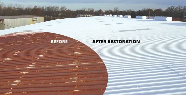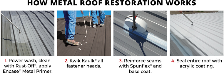 Stops leaks, inhibits rust, and provides an energy-efficient, long-lasting, attractive finish coat which will extend the life of your roof for years. During the restoration process, each problem area is systematically addressed, repaired and resealed; then the entire roof is coated with a reflective finish coat.